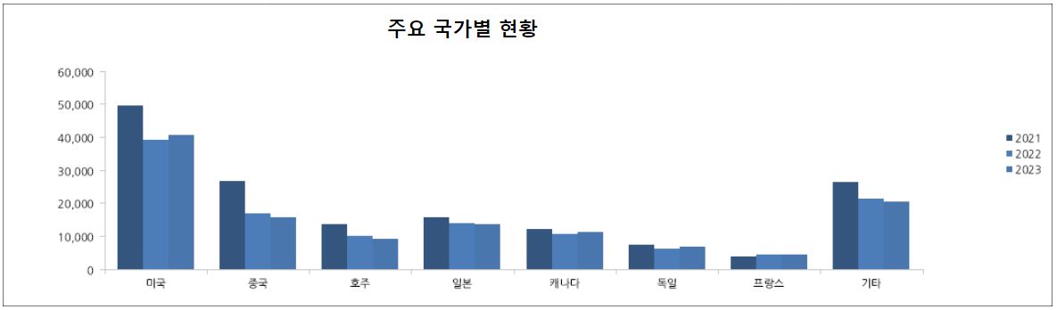 2021~2023연도 별 주요 국가의 유학생 수 그래프를 분석해 보면 전체적으로 감소추세임을 알 수 있습니다.