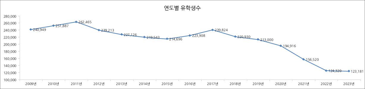 2009~2023년까지의 각 연도별 유학생 수입니다.
