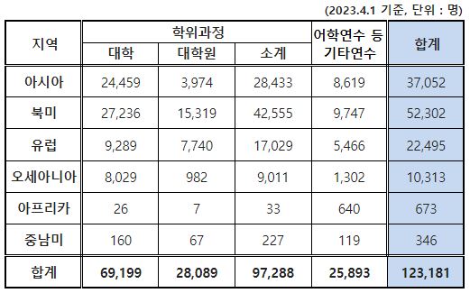 2023년도 기준 총 12만 3천 명의 유학생을 대륙별로 구분한 자료입니다.